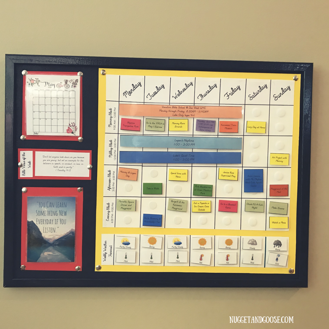 Once the weather and necessities are on the board we can tackle the fun part – filling the blank spaces with fun Summer activities! Of course this doesn’t mean that they will get to have a fun, over-the-top adventure every single day. Sometimes it might be something small like a baking project or arts and crafts with Mommy or a play date with cousins. The important thing is that the boys will be able to see exactly how we will be spending our time and get to prioritize the activities that they value most.