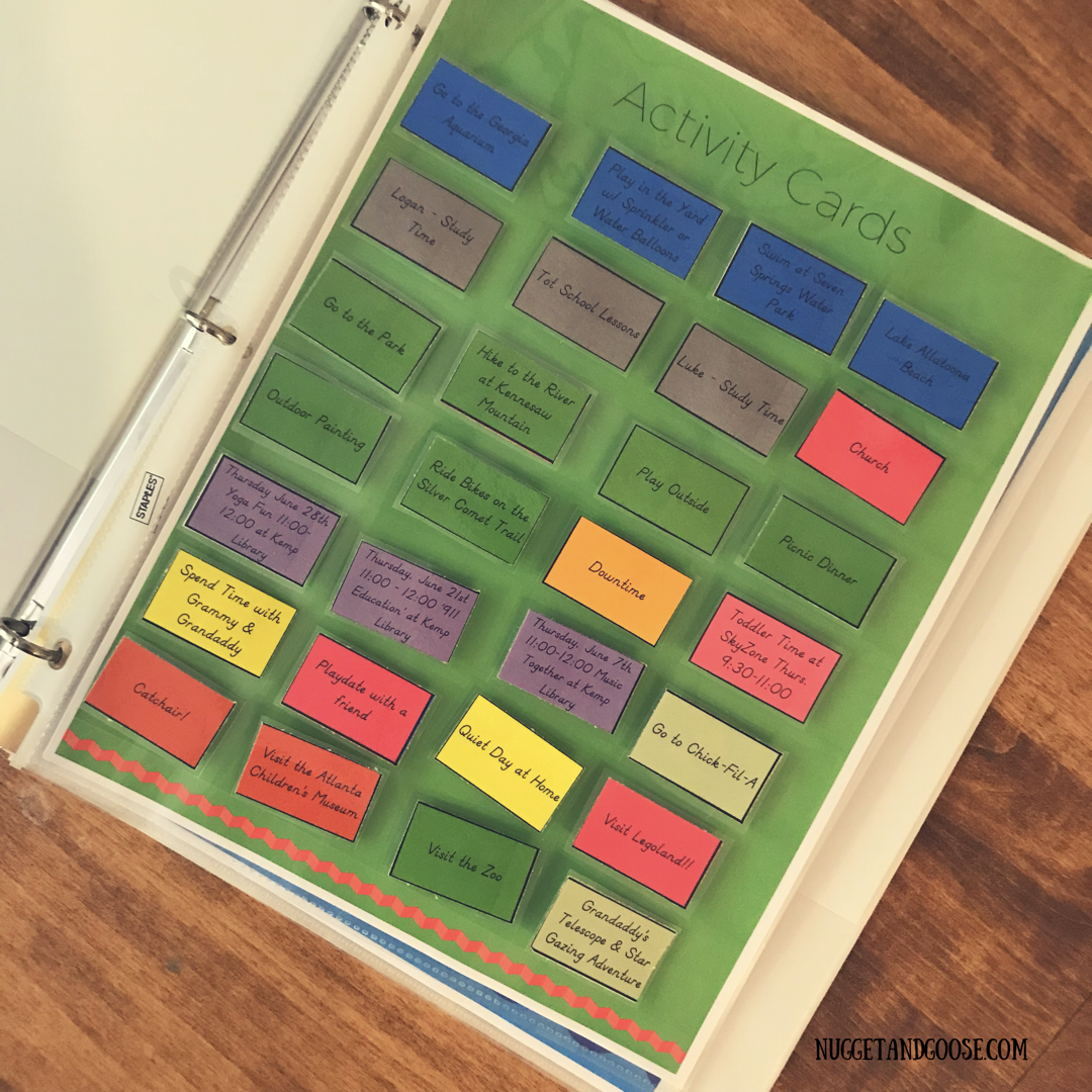 This notebook is a great companion tool to the summer schedule board. It has 2 main sections: the first contains storage pages for your weather and activity cards so you don’t have to hunt through a pile of activity cards to plan your week. The second section is a series of page protectors for storing flyers and brochures about all the summer activities in your area. If you’re like me, you see a flyer for some cool even and think ‘hey that would be fun!’ but by the time the even rolls around you’ve lost the flyer and forgotten all about it. This gives you a handy place to keep those flyers as well as a reference for admission prices, opening/ closing times and special promotions.