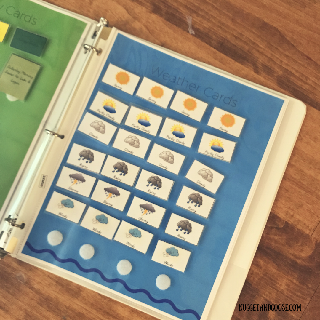 - Use Velcro tabs (be sure to use the opposite side from what was used on your activity cards!). Adhere in a grid pattern on your sheet protector. This is where you will store your activity and weather cards when not in use.