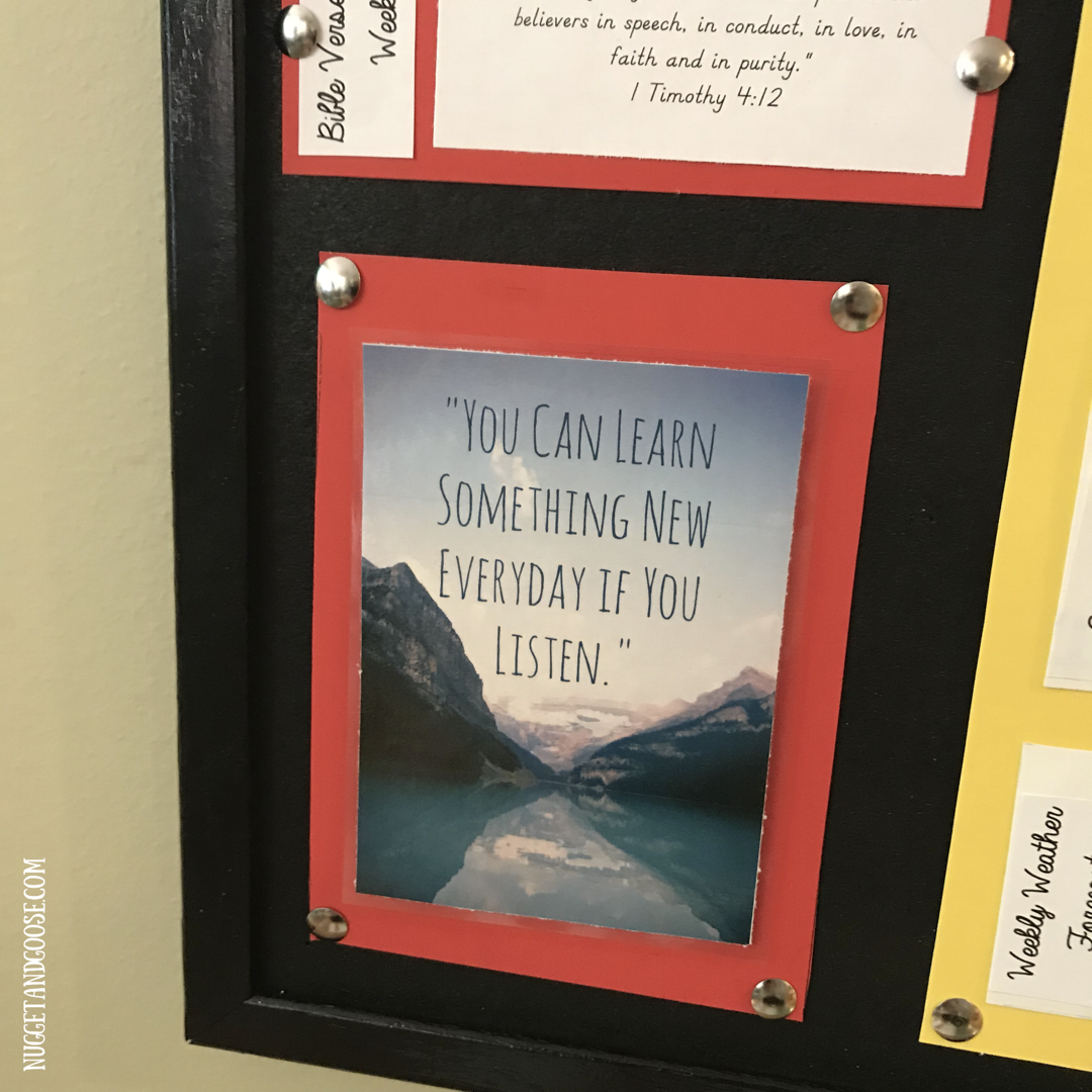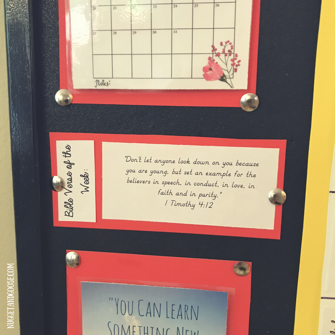So basically, this is a cork-board that shows us the upcoming week, with each day divided into 4 sections. Below that is a place to indicate each day’s weather and temperature and on the left you’ll see a monthly calendar, bible verse of the week, and an interchangeable space that I intend to use for inspirational quotes, pictures or notes.